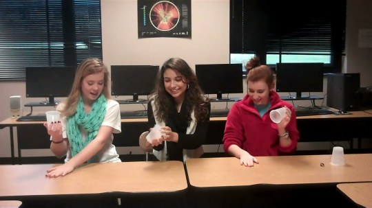 Seniors Anastatia Hollis and Shelby Major demonstrate Pitch Perfect’s Cup Song with Rachel Wakeford ’13 and Rachel Slosman ’15.
